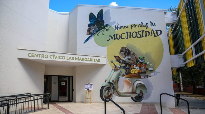 El Centro Cívico de Las Margaritas, que abre sus puertas a pleno rendimiento después de su reciente remodelación integral, estrena una decoración dedicada a Alicia en el País de las Margaritas, a través de varios murales de gran formato que decoran la fachada del edificio.