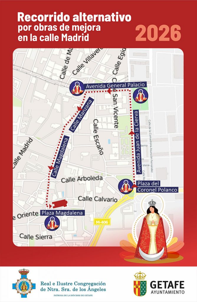 Las procesiones de las Fiestas Patronales en honor a Nuestra Señora de los Ángeles contarán este año con recorridos alternativos debido a las obras que se están ejecutando en la calle Madrid y su entorno.