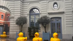 El artista dEmo ha instalado su última intervención en los jardines del hotel Santo Mauro deMadrid, donde ha desplegado una serie de enormes patos de