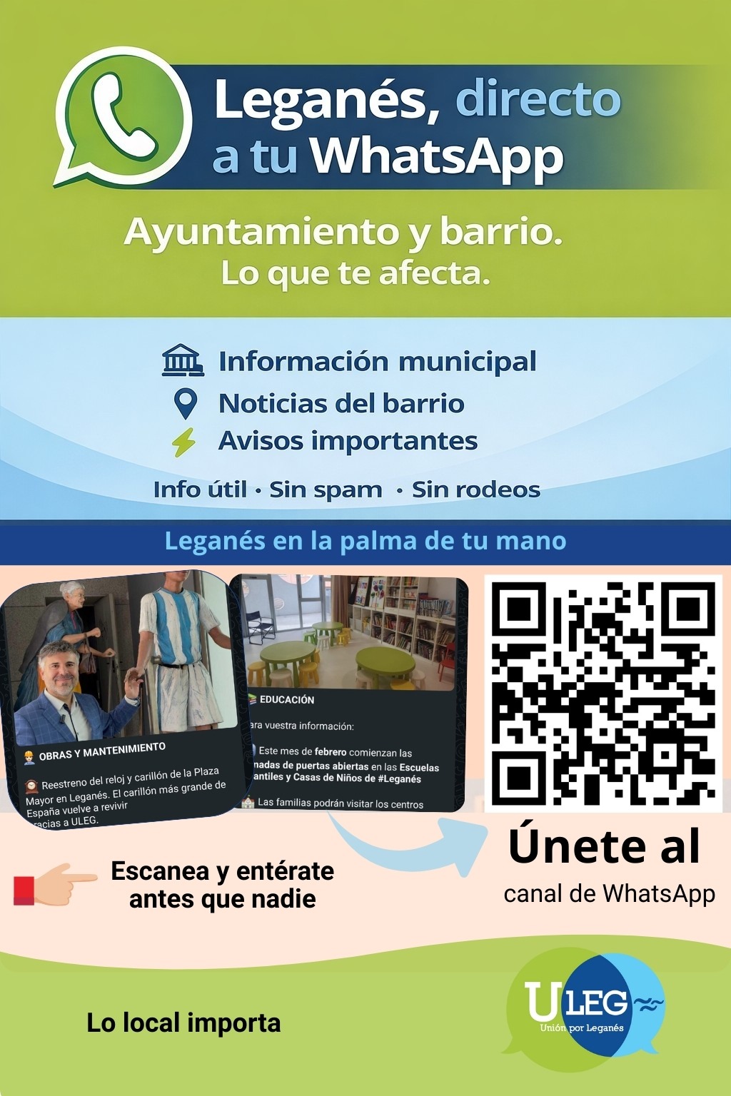 Unión Por Leganés ULEG pone en marcha un nuevo canal oficial de WhatsApp para acercar de forma rápida, sencilla y directa la información municipal y de actualidad a los vecinos del municipio. Con esta iniciativa, el partido vecinal «quiere facilitar el acceso a la información sobre la actividad del Ayuntamiento y la gestión municipal con ULEG en el gobierno, apostando por una comunicación cercana, transparente e inmediata. A través de este canal, los vecinos podrán recibir notas de prensa, información sobre cursos y talleres, ayudas y subvenciones, actuaciones municipales, programaciones y otras noticias de interés».